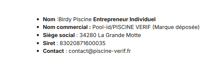Obligations légales de sécurité : L'utilisateur est informé que la mention du dispositif de sécurité au sein du rapport POOL ID IMMO ne dispense en aucun cas le propriétaire de faire réaliser un diagnostic de sécurité obligatoire auprès des autorités ou personnes agréées conformément à la réglementation en vigueur. Le rapport POOL ID IMMO est un outil de contrôle technique visuel et ne remplace pas l'attestation de conformité officielle requise par la loi.